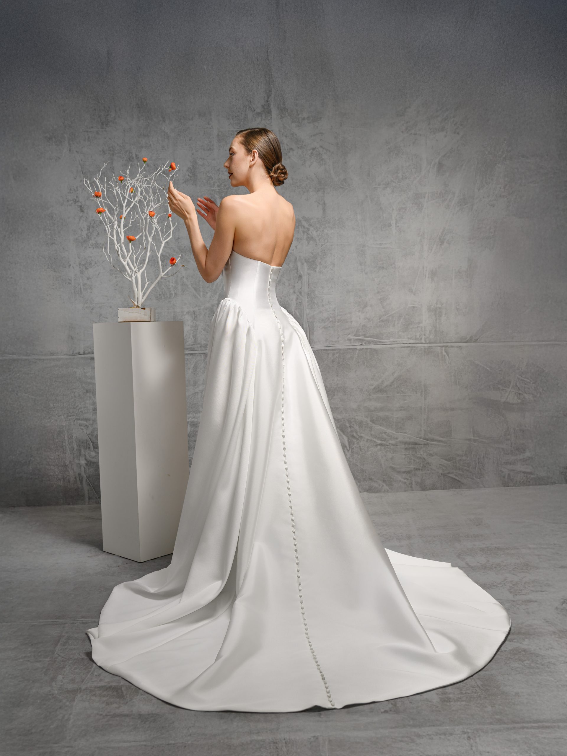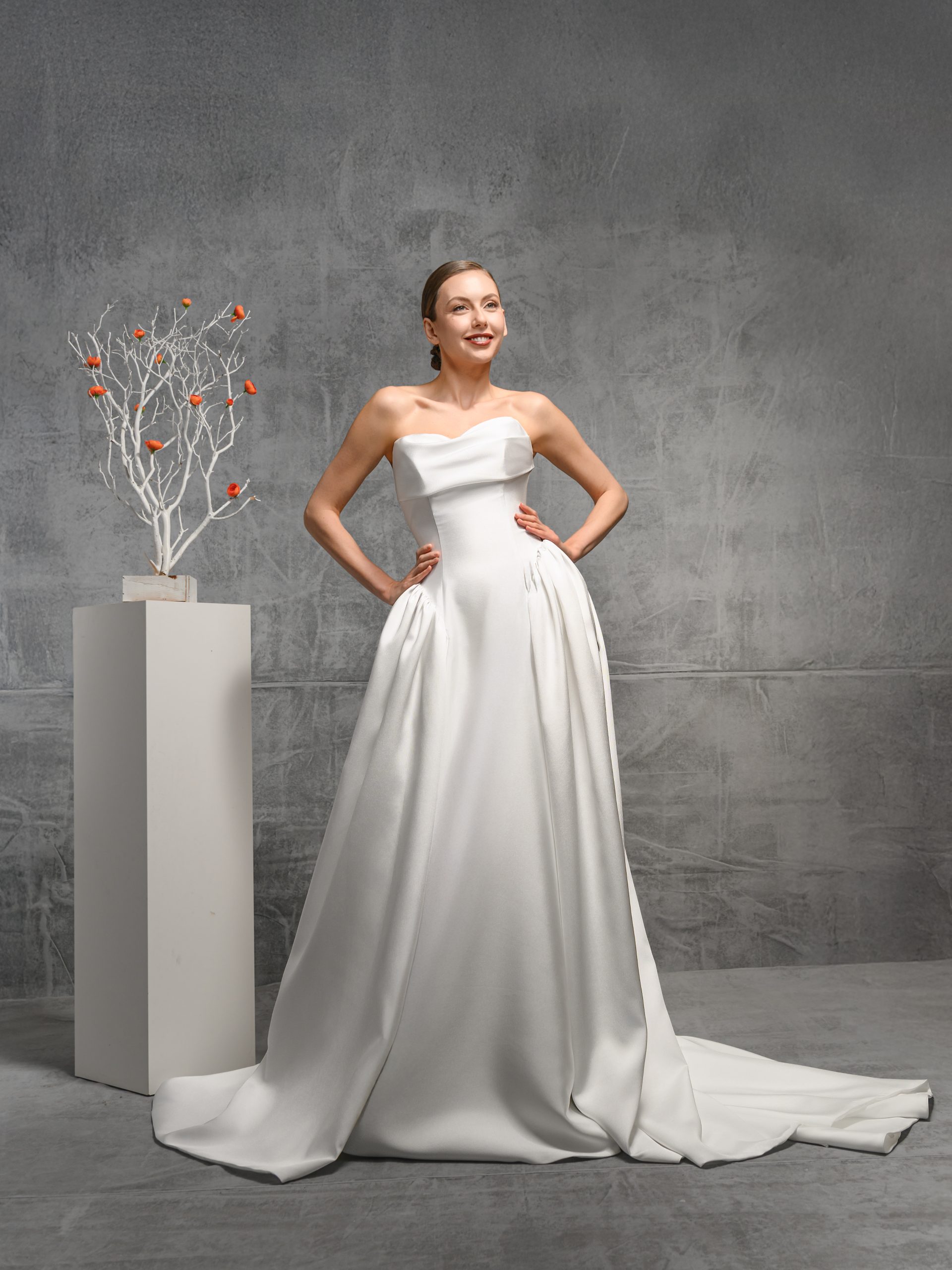 This modern strapless gown features a sculpted bodice with a clean straight neckline and subtle pleating at the waist for a flattering silhouette. Finished with a smooth, flowing skirt and soft train, it’s a refined choice for the bride who loves understated elegance with architectural lines.