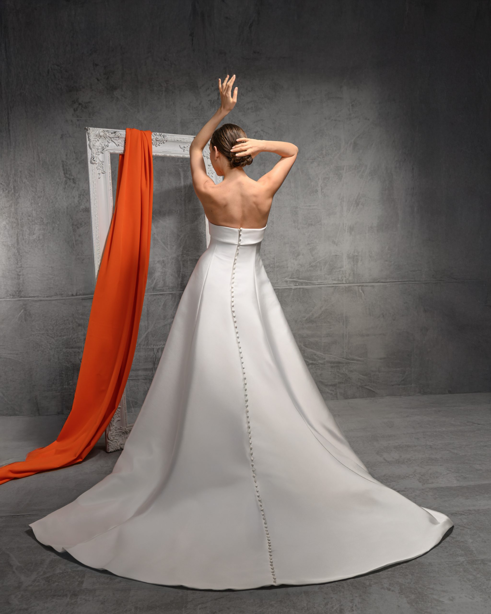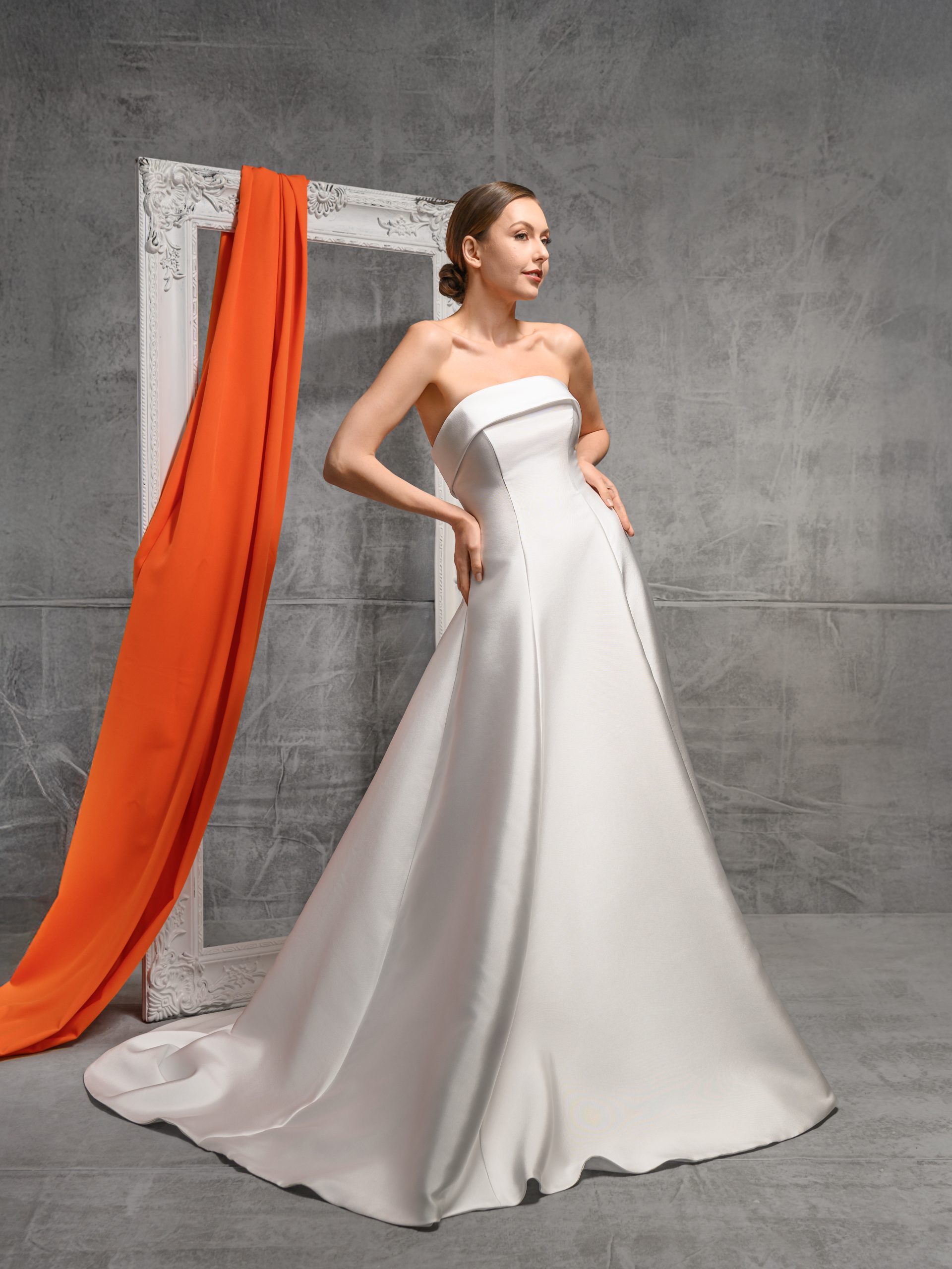 This modern strapless gown features a sculpted bodice with a clean straight neckline and vertical seams which elongate the bodice and create a very flattering silhouette. Finished with a smooth, flowing skirt and soft train, it’s a refined choice for the bride who loves understated elegance with architectural lines.