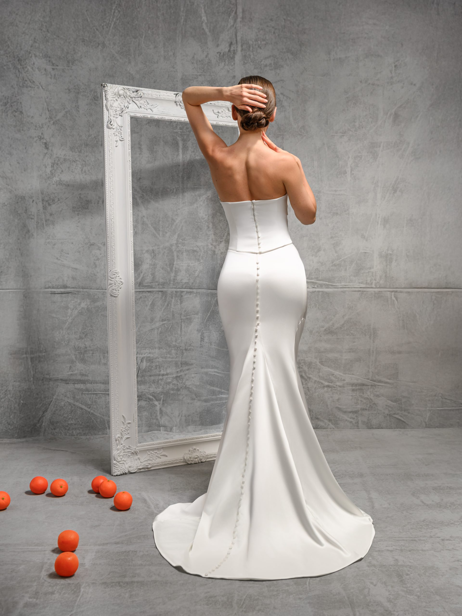 This refined two-piece bridal ensemble is the definition of modern elegance. The strapless top features soft draping across the bodice, creating a sculpted yet relaxed silhouette that flatters the figure while adding a touch of understated romance. Its clean lines and minimalist structure make it effortlessly chic.