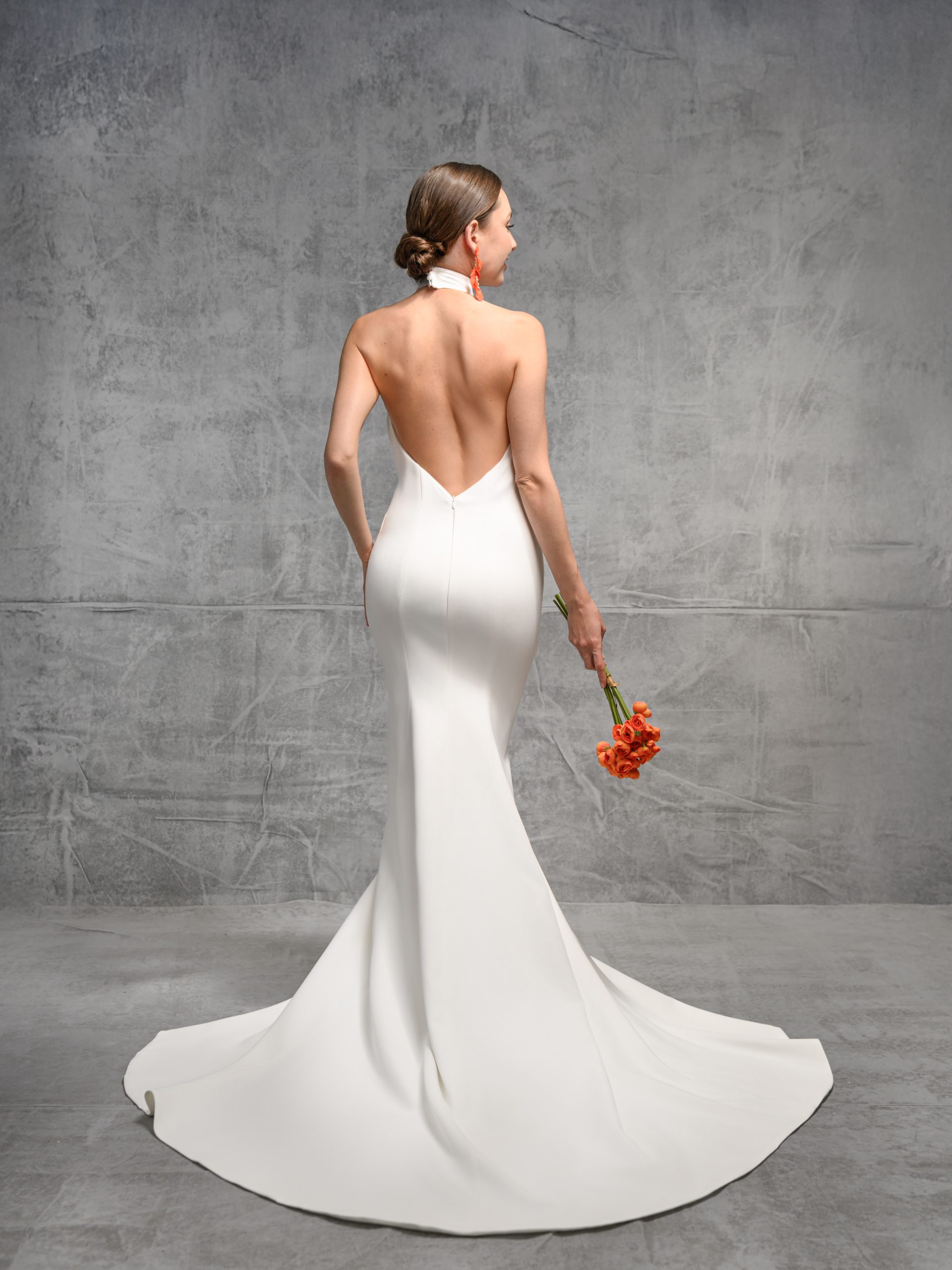 This striking wedding gown is designed for the modern bride who loves clean lines with a bold, fashion-forward edge. The elegant halter neckline beautifully frames the shoulders and neck, creating a refined and elongated silhouette, while the open arm line adds a touch of contemporary allure.